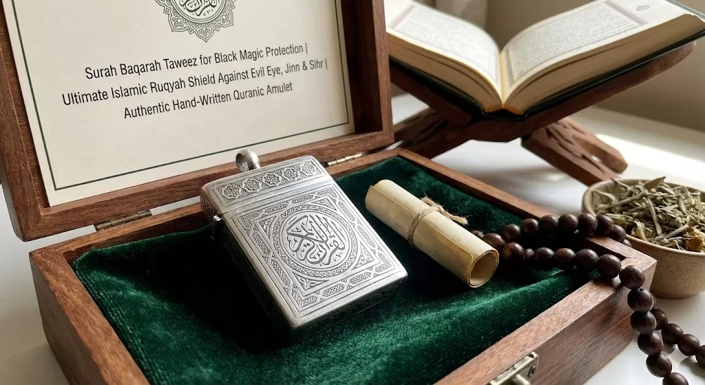 Prophet Muhammad (PBUH) said: "Recite Surah Al-Baqarah, for to take it is a blessing and to give it up is a cause of grief, and the magicians cannot confront it." (Muslim). This authentic hand-written taweez harnesses the immense power of Surah Al-Baqarah to serve as a continuous shield against the darkest forms of Black Magic (Sihr), Jinn possession, and the destructive Evil Eye.